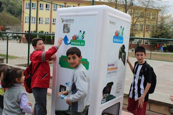 对于保护流浪猫狗的热爱动物的人们来说这真的是一个特别棒的机器。这款机器是由土耳其公司Pugedon发明的,他们承诺不会向政府收取费用,现在已经在土耳其街头、公园等公共场所投放许多这种自动贩卖机,只要有人将可回收的塑料瓶投入进去,那么那些流浪猫狗就会拥有食物和水,这样它们就可以一直生存直到等到有主人认领自己。另外,这种机器还可以倡导人们保护环境,减少街道垃圾。
